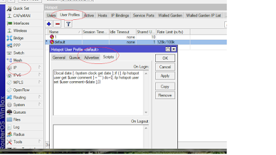 نقوم بتحديد صلاحية الكروت لمستخدمين الـ hotspot حيث نقوم بالذهاب الى قائمه الـ IP ثم user profile ونختار نافذة الـ scripts ونعمل لصق لهذا الكود كما في الصوره ادناه :