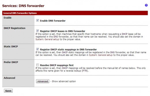 جميع الإعدادات الأخرى اختيارية وتفسيرية. أحب تمكين ميزة تسجيل DHCP حتى أتمكن من حل أجهزة الكمبيوتر العميلة عبر DNS بدلاً من netbios. لتطبيق التغييرات وتنشيط الخدمة ، انقر فوق زر الحفظ.
