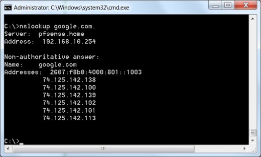 مثال: nslookup google.com. (تأكد من استخدام فترة لاحقة على الطلب) إذا كان كل شيء يعمل كما هو متوقع ، يجب أن تشاهد استجابة ناجحة من pfSense.