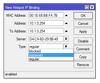 لعمل ذلك قم بالتوجة الى قائمة ip>hotspot>hosts ثم قم بالنقر بزر الماوس الايمن على ip الجهاز المطلوب عمل له البايباسد واختر Make Binding كما بالصورة التالية :