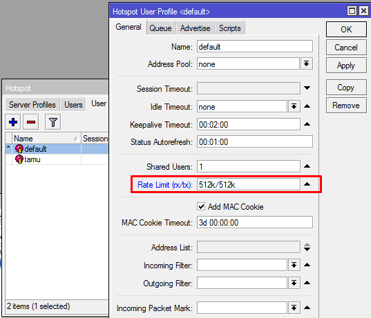 حد معدل الاستخدام Rate Limit في هذا الملف الشخصي hotspot server profile ، سيحد تلقائيًا من إجمالي عدد الزيارات على شبكة Hotspot Mikrotik.