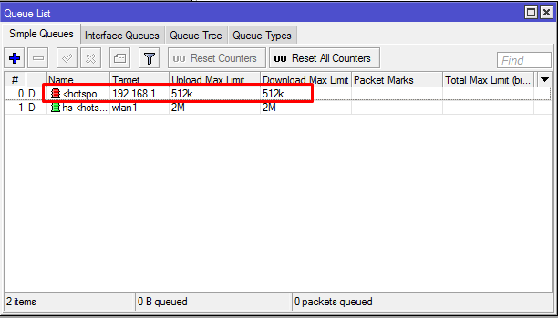ثم قم بتجميع Queue Tree خاص بها من قائمة Queue للتحميل عبر هوت سبوت في حدود الحد الأقصى 1 ميجا بايت و 2 ميجابايت.