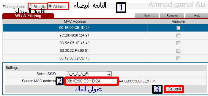 وهذه من خلالها يمكنك حجب جهاز محدد من الاتصال بالشبكه عن طريق رقم يسمى عنوان الماك ويكتب في AA:BB:CC:DD:FF:EEصوره هكذا