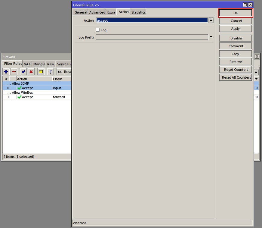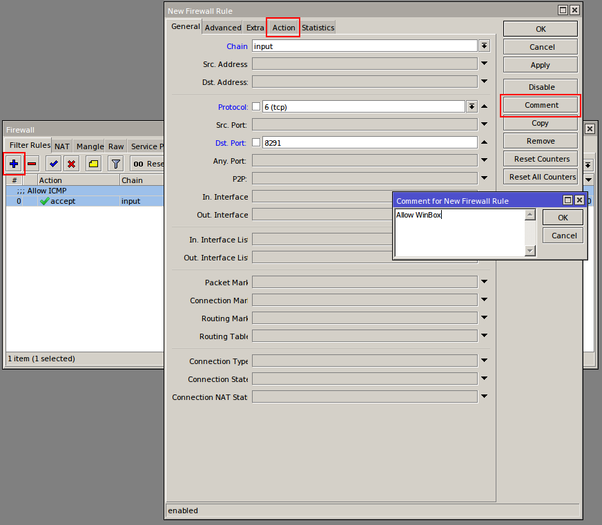 [newadmini@mikrotik] > ip firewall filter add action=accept chain=input comment="Allow WinBox" dst-port=8291 protocol=tcp