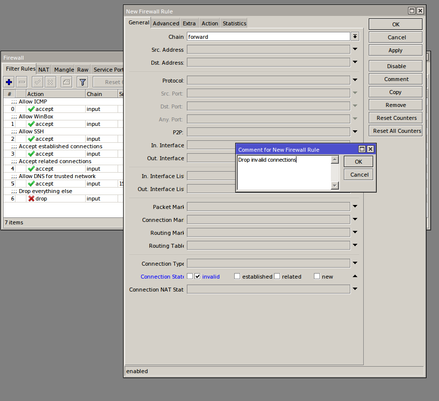 [newadmini@mikrotik] > ip firewall filter add action=drop chain=forward comment="Drop invalid connections" connection-state=invalid