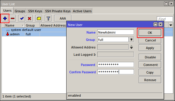 [admin@mikrotik] > user add group=full name=newadmini password=H@rDt0Gu3SsP@sSw0Rd