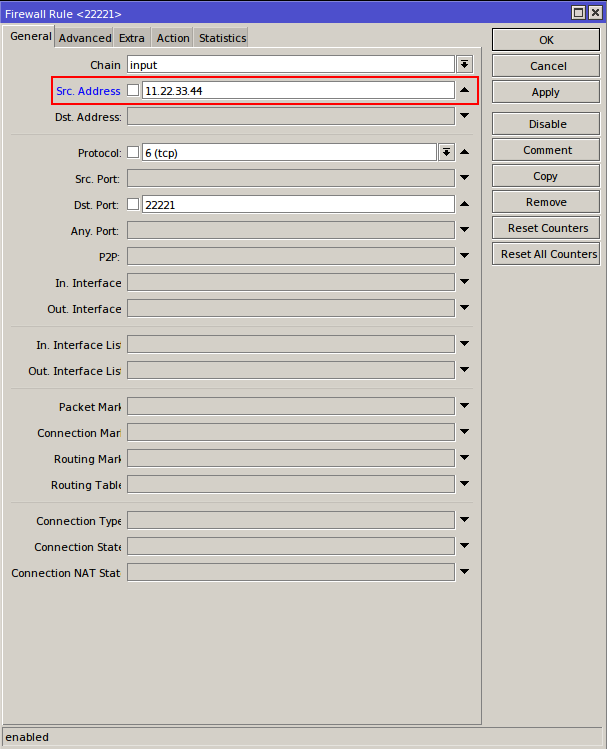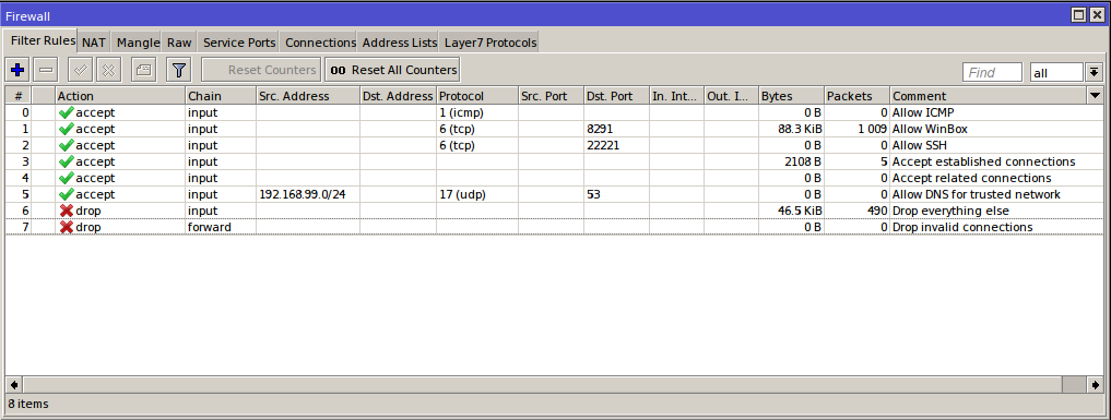 يجب أن يتم ذلك لكافة القواعد التي تقبل الاتصال على منافذ الخدمة (SSH و WinBox).