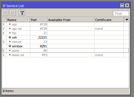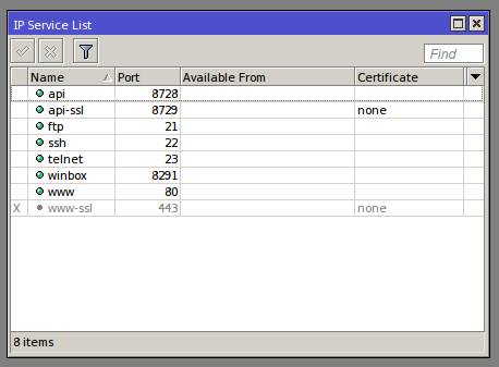[newadmini@mikrotik] > ip service disable api,api-ssl,ftp,telnet,www,www-ssl