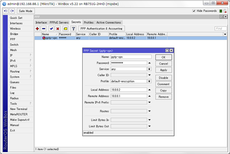 | ip pp remote address 10.0.0.2 | |