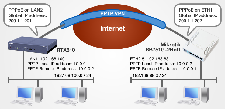 مثال على إعداد PPTP VPN على RTX810 و MikroTik RB751G