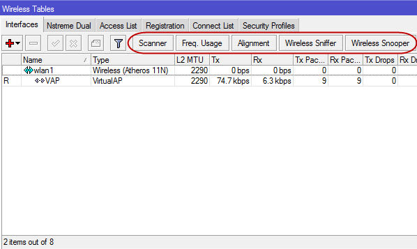 هناك العديد من الأدوات اللاسلكية في Mikrotik مع وظائف مختلفة ، وهي: Scanner, Frequency Usage Snooper, Align, and Sniffer. إليك شرح لكل أداة لاسلكية: