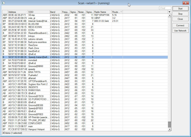 كما يشير الاسم ، تعمل الماسحة الضوئية على المسح الضوئي عن طريق إظهار نقاط الوصول النشطة حول الجهاز. ستقوم الماسحة الضوئية بعرض معلومات من AP حول Mikrotik بالتفصيل بدءاً من Mac Address و SSID و Band و Frequency و Signal و SNR و Radio Name وحتى إصدار RouterOS (إذا كان الجهاز هو Mikrotik). هنا مثال على استخدام الماسح الضوئي :