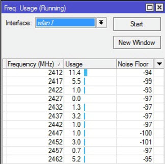 هذه الأداة تعمل على مسح استخدام التردد حول جهاز Mikrotik الخاص بك. عرض التردد سيعرض الاستخدام لكل تردد قناة سواء كان مستخدمًا على نطاق واسع وما هو التردد الامثل . حتى نتمكن من تحديد أي تردد ليست مزدحمة للغاية للمستخدمين للحد من التدخل باشارات الاجهزة .