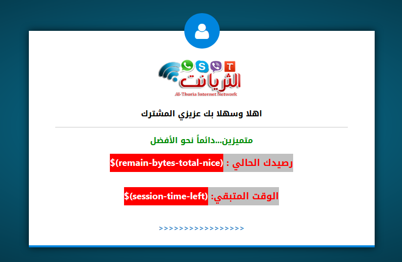 صفحة alogin مابعد تسجيل الدخول حيث تظهر التحميل المتبقي والوقت المتبقي للمشترك