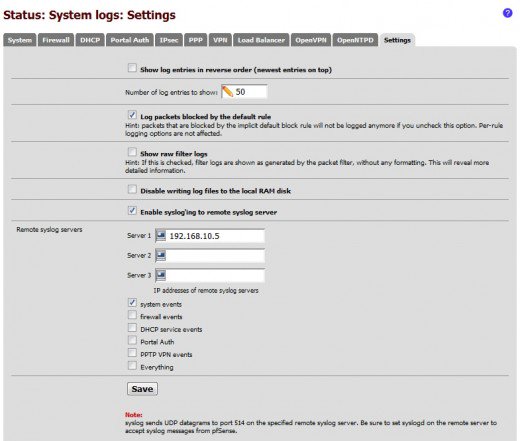 - Specify syslog servers تحديد خوادم سجل النظام – أدخل عنوان IP الخاص بنظام تشغيل خادم Kiwi syslog. يدعم PfSense 2.0 ما يصل إلى 3 وجهات سجل عن بعد.