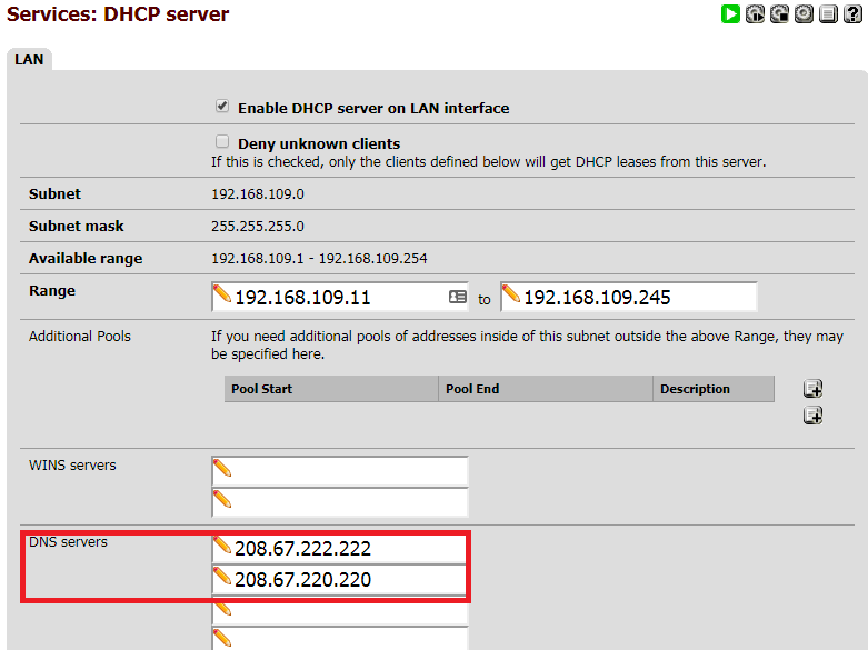 - من المهم أيضًا تكوين DHCP Server. انتقل إلى Services>DHCP server. عيّن خوادم نظام DNS servers على عنوان IP نفسه الذي أدخلناه في الإعدادات العامة. مرة أخرى لا تنسى حفظ التغييرات.