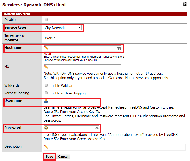 - سجل الدخول إلى حساب مشرف pfSense وانتقل إلى Services > Dynamic DNS . ثم اعمل إدخال جديد.