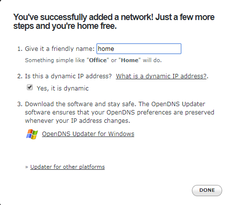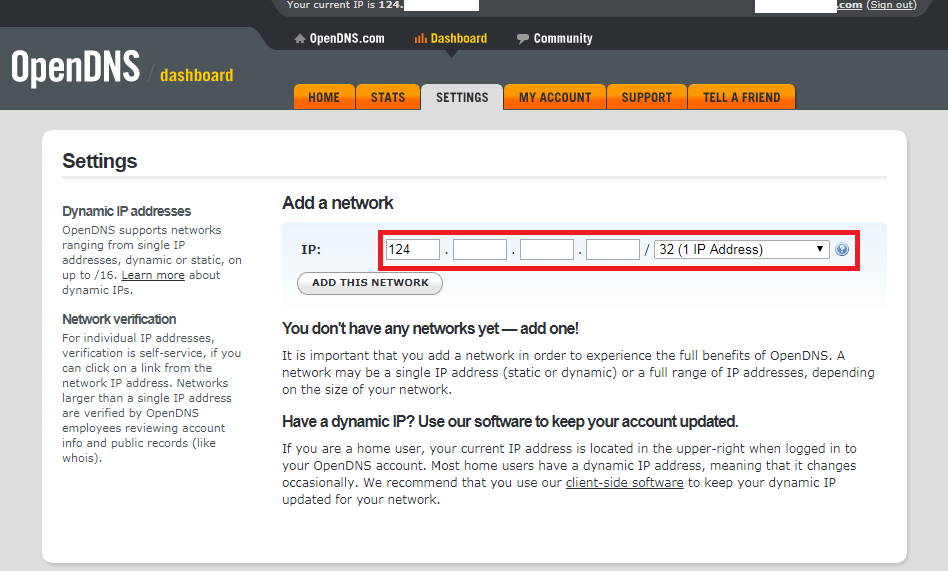 بمجرد التسجيل ، قم بتكوين إعدادات حساب OpenDNS الخاص بك. أضف عنوان IP العام لشبكتك.