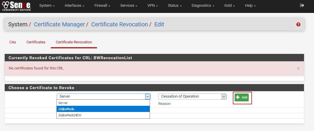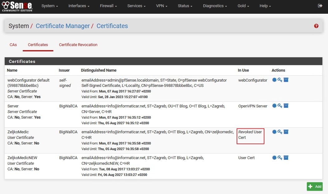 إذا ذهبنا إلى System | Cert.Manager | Certificates سنرى أن شهادة المستخدم ZeljkoMedic تم إبطالها
