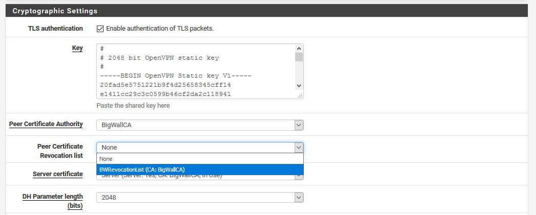 Cryptographic Settings | Peer Certificate Revocation list | حدد قائمة الإبطال – في حالتي هي BWRevocationList | مرر إلى أسفل الصفحة ثم احفظ