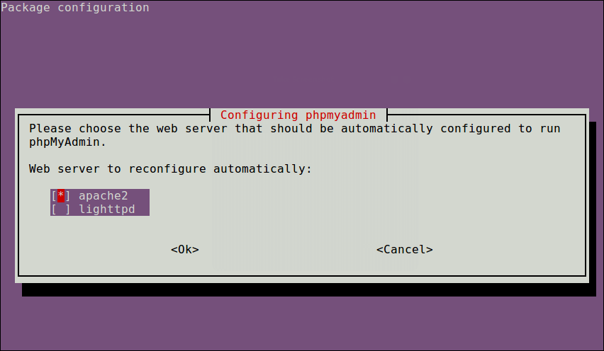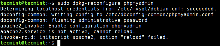 إذا قمت بالفعل بتثبيت حزمة ، على سبيل المثال phpmyadmin ، فيمكنك إعادة تكوينها بتمرير اسم الحزمة إلى dpkg-reconfigure كما هو موضح.