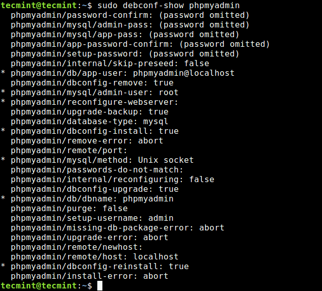 لعرض الاعدادات الحالية لحزمة مثبتة “phpmyadmin” ، استخدم الأداة debconf-show كما هو موضح.