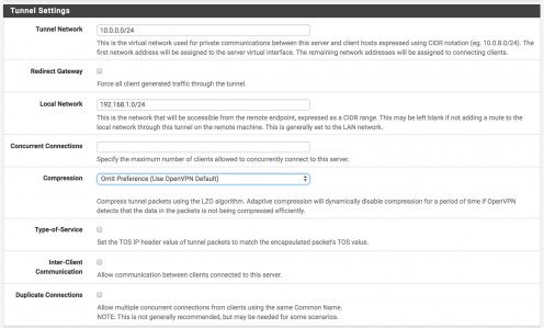 يجب أن تكون tunnel network شبكة جديدة غير موجودة حاليًا على الشبكة أو جدول توجيه جدار الحماية pfSense. عندما يتصل العملاء بشبكة VPN ، سيحصلون على عنوان في هذه الشبكة. على سبيل المثال ، يمكنك إدخال 10.0.0.0/24 طالما أن هذا غير موجود بالفعل على شبكتك.
