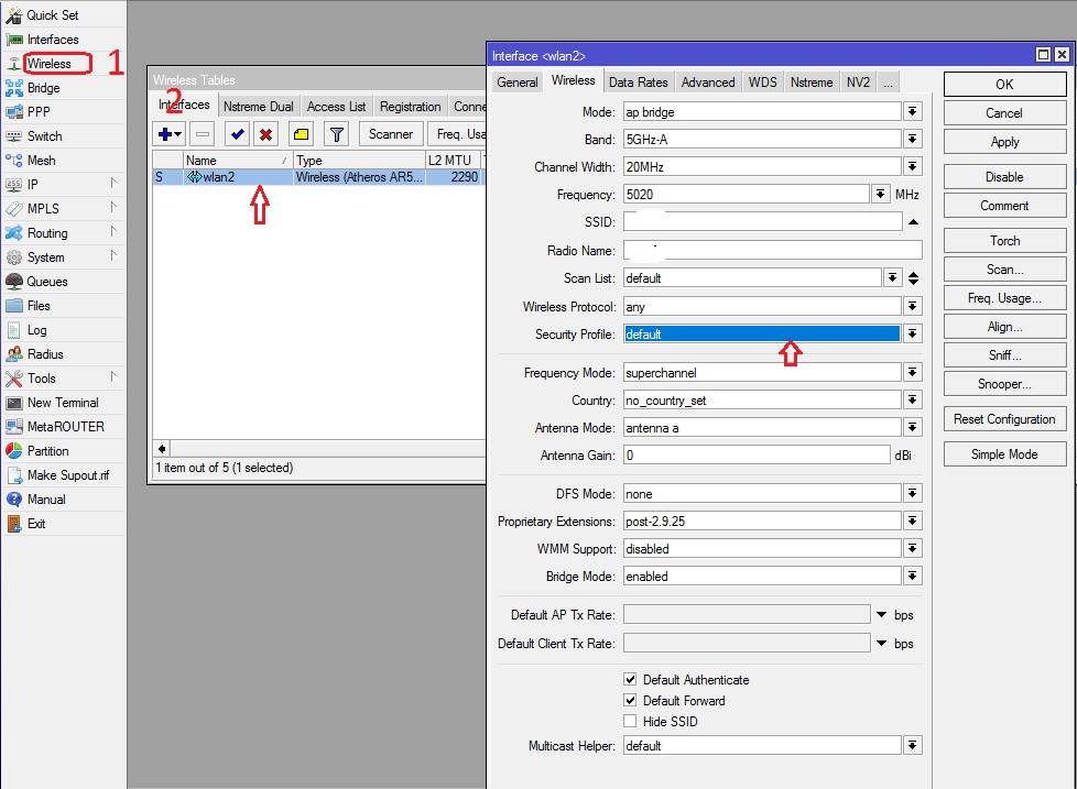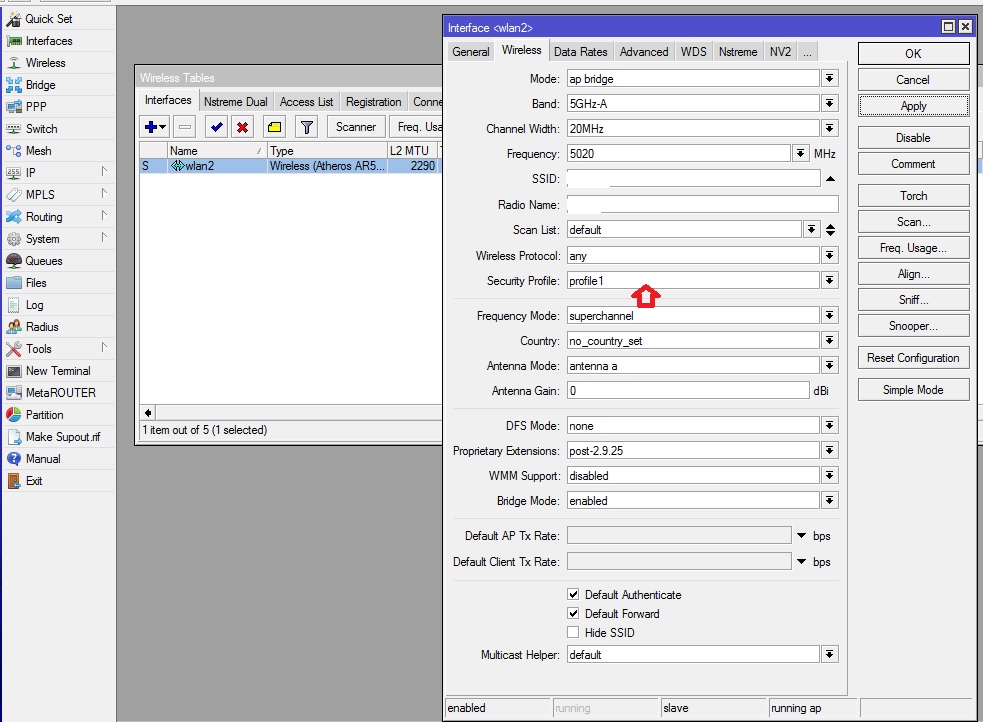تحتاج إلى إنشاء ملف تعريف جديد. قم بتسجيل الدخول إلى جهاز التوجيه الخاص بك عبر Winbox ، وانقر فوق علامة التبويب wireless في القائمة الرئيسية ، وانقر نقرًا مزدوجًا فوق الواجهة اللاسلكية التي تريد تكوين ملف تعريف الأمان عليها.