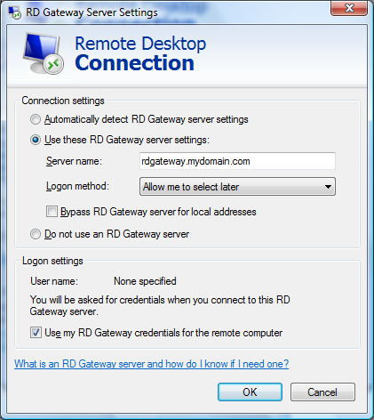 لا يهم أن اسم خادم RD غير قابل للحل على الإنترنت أو أن عنوان IP هو من نطاق خاص. طالما أن بوابة RD يمكنها حل الاسم ، ويتم منح الحقوق المناسبة لبيانات اعتماد المستخدم التي يستخدمها عملاؤك ، يمكنهم الاتصال بخادم Destop عن بعد.