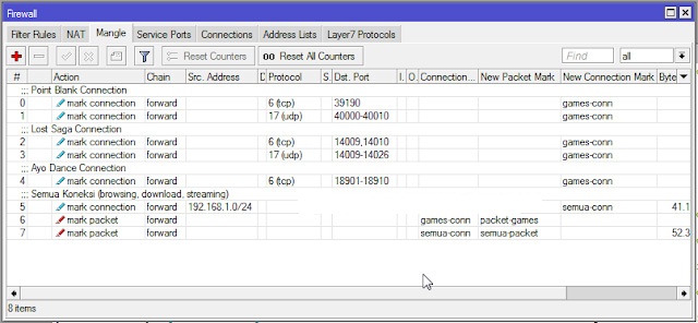 إذا كان صحيحًا ، فيجب أن يكون فيWinbox IP > Firewall > Mangle هناك 7 خطوط متشابكة ، كما هو موضح أدناه: