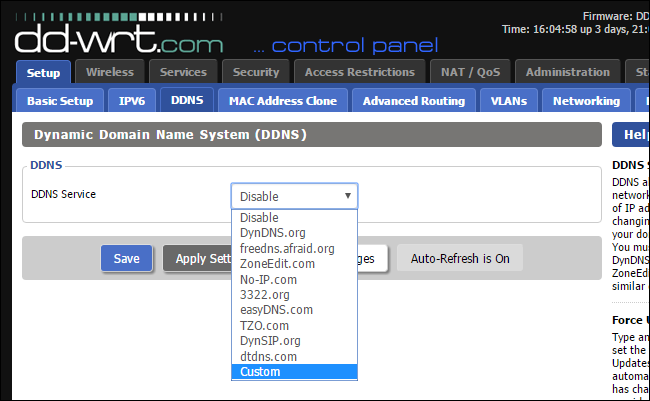 في DD-WRT ، ستجده تحت Setup > DDNS. افتراضيا، يتم تعطيله. افتح القائمة المنسدلة ، كما هو موضح أدناه ، وحدد “Custom”. كما يمكنك مشاهدة DD-WRT (والعديد من أجهزة الراوتر الأخرى) تأتي مع إدخالات مسبقة التكوين لخدمات DDNS المختلفة ولكن الإدخال المخصص يوفر أكثر مرونة (إذا كان لديك).