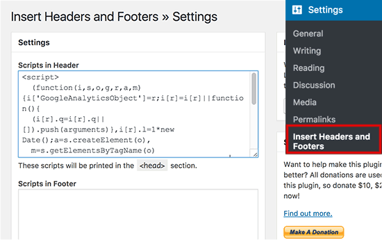 عند التنشيط ، تحتاج إلى زيارة الإعدادات »إدراج صفحة رؤوس الصفحات وتذييلاتها. هنا يجب لصق رمز Google Analytics الذي قمت بنسخه في الخطوة 4 في قسم الرؤوس.