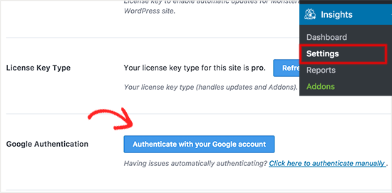 في هذه الشاشة ، يلزمك النقر على زر “مصادقة باستخدام حساب Google” الخاص بك لتوصيل Google Analytics بموقعك على WordPress.
