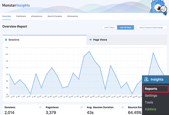 أفضل جزء حول MonsterInsights هو أنه يمكنك عرض تقرير Google Analytics داخل لوحة معلومات WordPress الخاصة بك. ما عليك سوى الانتقال إلى الإحصاءات »صفحة التقارير للتحقق من نظرة عامة سريعة على بيانات التحليلات.