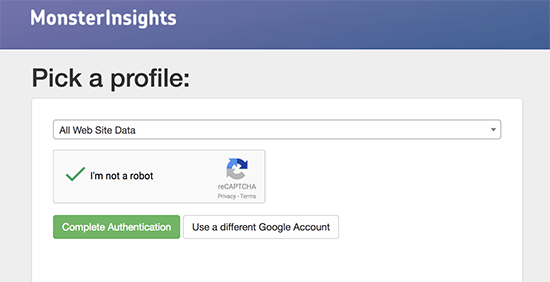 الخطوة الأخيرة هي اختيار ملف التعريف الذي تريد تتبعه. تحتاج إلى تحديد موقع الويب الخاص بك هنا ثم انقر فوق الزر “Complete authentication” للمتابعة.