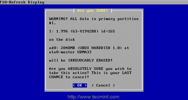 ملاحظة: سيتم عرض التحذير ، حيث يخبرك أنه أثناء تثبيت قسم pfsense سيتم الكتابة فوقه. انقر على الزر “موافق OK ” للمتابعة ..