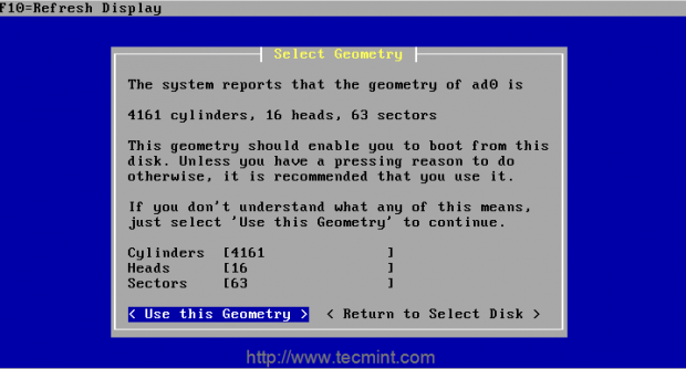 11. اختر size /heads/cylinder size ، وهنا أستخدم خيار الإعدادات الافتراضية “Use this Geometry” للمضي قدمًا للتثبيت.
