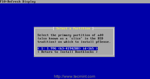 16. حدد الان قسمًا لتثبيت pfsense ، والذي يسمى أيضًا بالشريحة في BSD.
