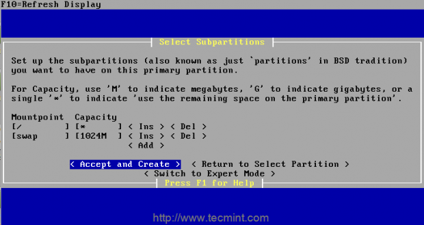 14. بعد ذلك ، حدد الأقسام التي تريد أن تكون لديك على القرص وإدخال الحجم للقطاعات ، ثم أضغط accept and create للموافقة على إنشاء القسم باستخدام الحجم المحدد أو يمكنك المضي قدما مع الخيارات الافتراضية.