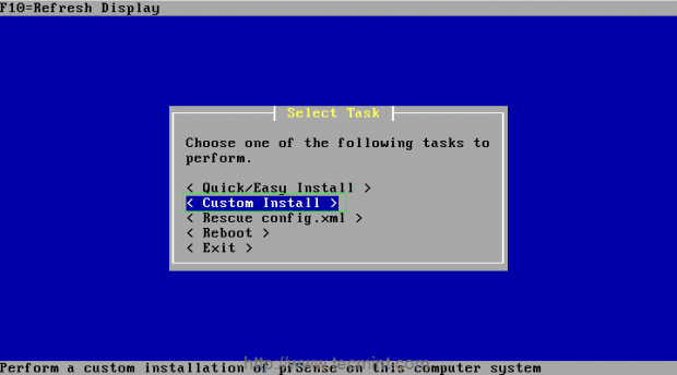 8. إذا كنت جديدًا في pfsense ، فاختر خيار “Quick / Easy Install” لجعل الأمور أسهل أو اختر “تثبيت مخصص” للحصول على خيارات متقدمة أثناء عملية التثبيت (موصى به للمستخدمين المتقدمين).