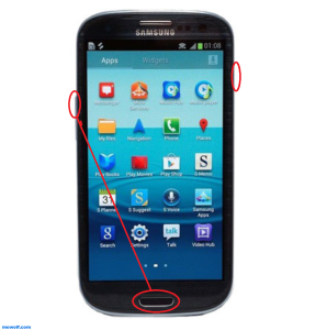 - 2 اضغط بشكل مستمر على زر رفع الصوت + زر القائمة الرئيسية +زر التشغيل حتى يظهر شعار سامسونج عندها اترك زر البور فقط مع ابقاء الزرين الاخرين مضغوطين كما بالصورة التالية :-