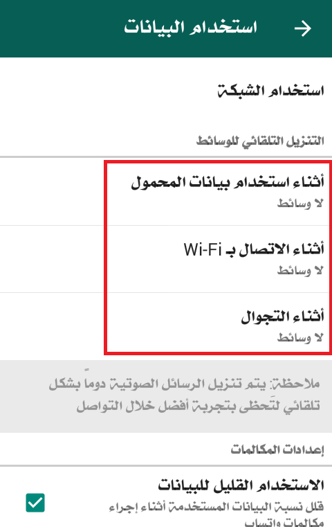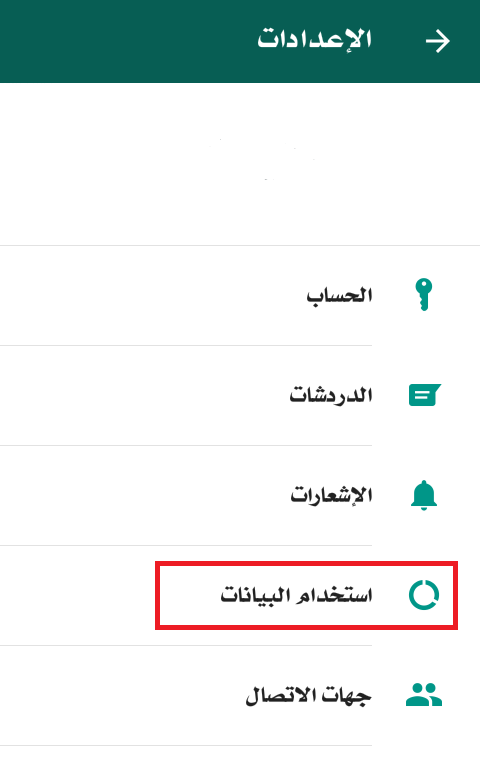 وذلك من خلال الذهاب الى اعدادات تطبيق الواتساب ثم الضغط على استخدام البيانات كما في الصورة التالية :