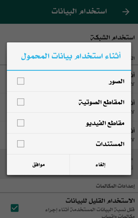 قبل كل شيء يجب ان نقوم بتعديل بعض الاعدادات في التطبيق لمنع عملية التحميل الأوتاماتيكي للصور والفيديو والملفات الأخرى .