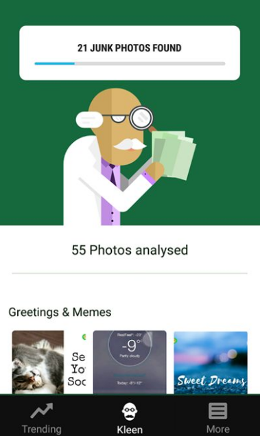 فبعد تحميل وتثبيث التطبيق في هاتفك قم بفتحه ثم الضغط على Kleen كما في الصورة حتى يتمكن التطبيق من حذف مهملات تطبيق الواتساب التي لن تحتاجها مجددا .