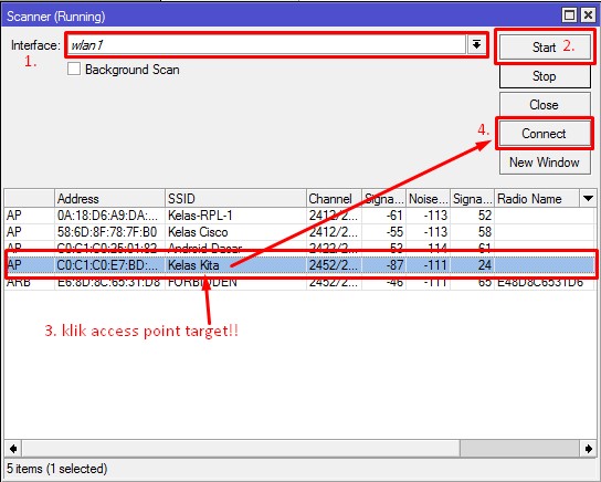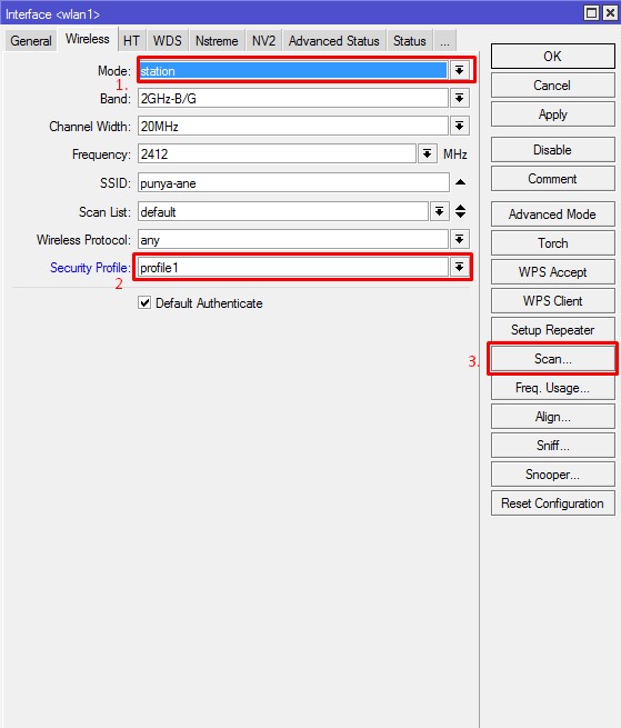 أفتح Winbox Mikrotik ثم انتقل إلى wireless interface و  wireless settings واختر الاعدادات كما بالصورة ادناة , ثم القيام بعمل scan لاستهداف نقاط الاكسس بوينت التي ستصبح مصدر اتصال بالإنترنت.