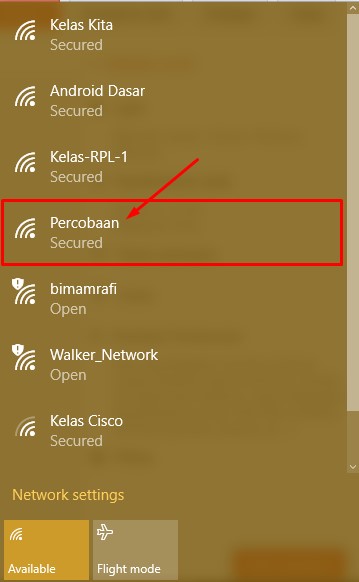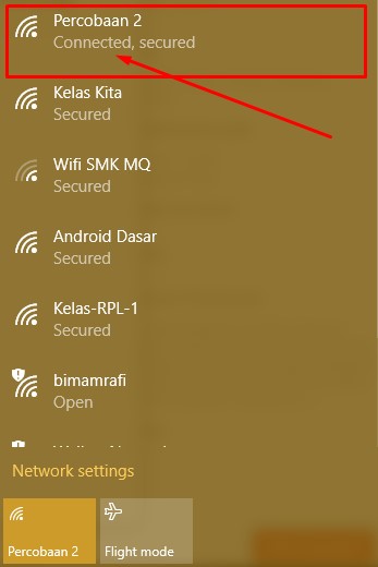 تم بالفعل إنشاء نقطة وصول افتراضية. سيظهر الان الاختبار بنجاح للنقطة إذا كان ظهور  SSID اللاسلكي الخاص بنا ناجحًا على شاشة Wifi على كمبيوتر محمول أو أجهزة أخرى مع نتائج الاتصال بنجاح أو بوجود اتصال بالإنترنت. كما في الصورة أدناه