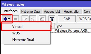 فقط بعد التكوين أعلاه ، يمكننا تكوين VAP (Virtual Access Point). مباشرة. انتقل إلى Wireless interface مرة أخرى واعمل اضافة add Virtual interface