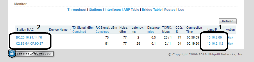 فتظهر لنا قائمة الاجهزة المتصلة على هذا الاكسس وهنا نبحث بينهن على اي جهاز غريب لايحمل رينج IP المايكروتك او الاكسسات الخاصة بشبكتك اذا كانت ليست ضمن الرينج شاهد الصورة التالية :-
