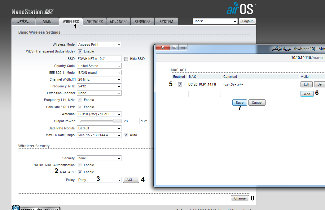 بعد المعاينة والملاحظة وعند اكتشاف IP غريب ( الصورة اعلاه توضيحية وهي سليمة ولايوجد IP غريب وهنا نفترض مثلا وجود IP 192.168.55.20 مثلا ) نقوم بالتوجة الى ماك ادرس هذا الجهاز ونقوم بنسخة والتوجة الى قائمة الوايرلس كما بالصورة ونتبع خطوات الصورة بحسب الارقام :-