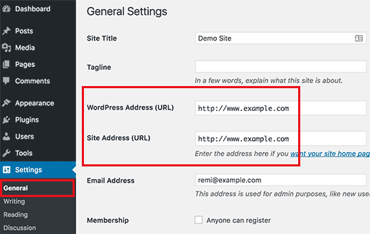 يمكنك ضبط تفضيلاتك عن طريق زيارة الإعدادات »الصفحة العامة. أضف عنوان URL المفضل لديك في حقلي “عنوان WordPress” و “عنوان الموقع”.